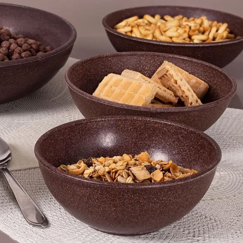 A tigela é confeccionada com fibra de madeira plástica, uma combinação que oferece leveza e resistência. Este material assegura um uso diário consistente e um toque atual à sua mesa, além de ser seguro para contato com alimentos.