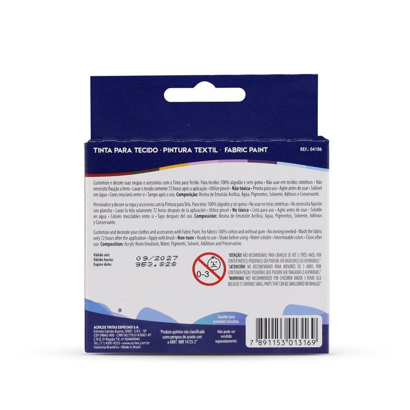 A Tinta para Tecido 6 Cores Acrilex é a escolha ideal para dar vida às suas criações em artesanato têxtil. Desenvolvida especificamente para tecidos de algodão e sem goma, esta tinta oferece aplicação suave e resultados vibrantes. Sua fórmula atóxica garante segurança para todos os artistas, e sua resistência às lavagens assegura que as obras permaneçam intactas e coloridas por um longo período. Com uma paleta de cores que inclui branco, amarelo ouro, vermelho fogo, azul turquesa, verde musgo e preto, em 6 potes de 15ml, você terá o necessário para explorar sua criatividade com a qualidade Acrilex.