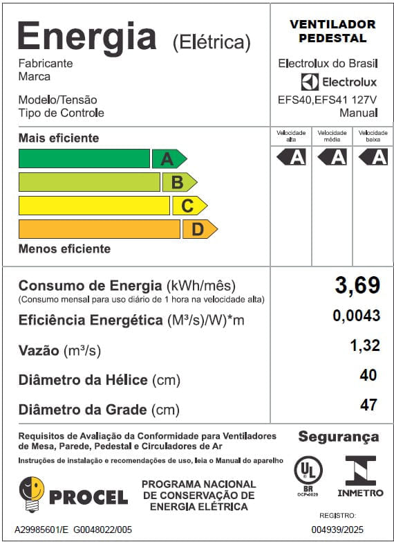 O Ventilador de Coluna Electrolux Efficient com DuoForce Air+ (EFD40) tem eficiência energética A em todas as velocidades, até mesmo na Turbo. Com certificação do Selo Procel, garante alto desempenho com consumo de energia.