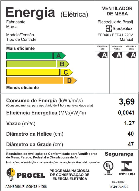 O Ventilador de Mesa Electrolux Efficient com DuoForce Air+ (EFD40) tem eficiência energética A em todas as velocidades, até mesmo na Turbo. Com certificação do Selo Procel, garante alto desempenho com consumo inteligente de energia.