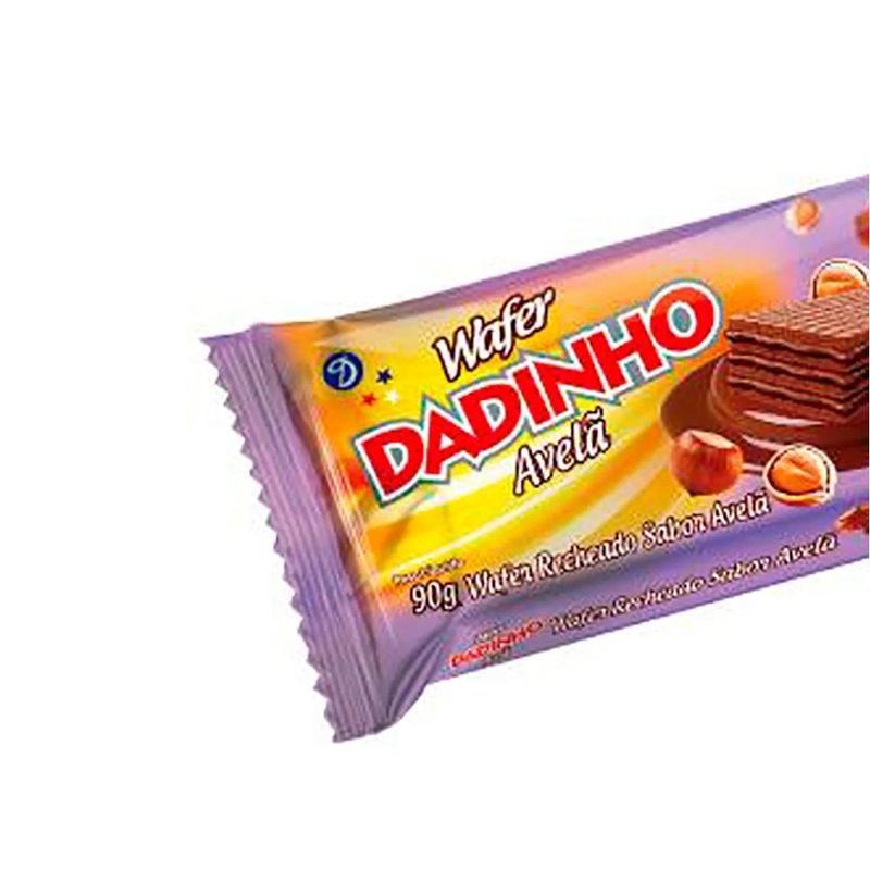 O biscoito wafer Dadinho apresenta um delicioso recheio com sabor marcante de avelã, proporcionando uma experiência gustativa rica e agradável.